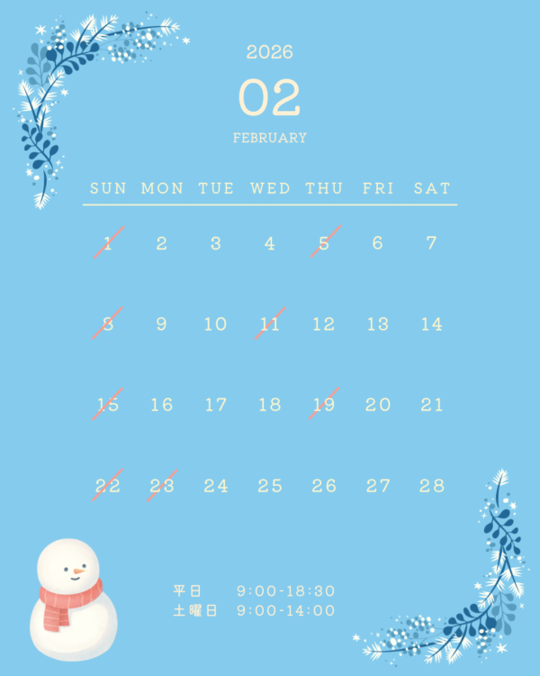 2月の休診日は木曜日、日曜日、祝日(11日、23日)となっております。